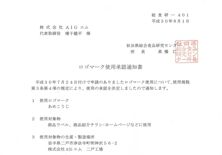 秋田県総合食品研究センターが4年間かけて開発した甘味は強いのにスッキリした味わいを持つ麹菌を使用しています。麹の品質基準に合格した秋田県内の麹製造会社だけが作っており、平成27年に菌株特許を取得しています。※偽物の「あめこうじ」にご注意ください。